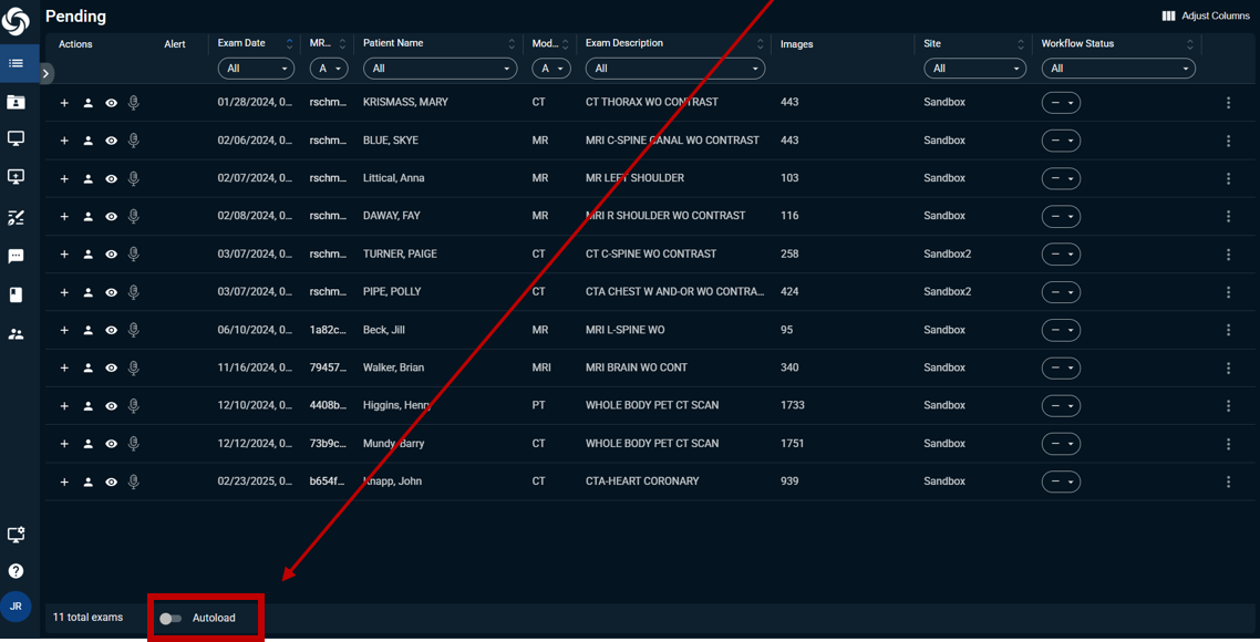 The toggle button, Autoload, is in the footer of the worklist. It can be enabled to automatically load the next order in the worklist into the Viewer and Reporter applications immediately after signing off the current report.