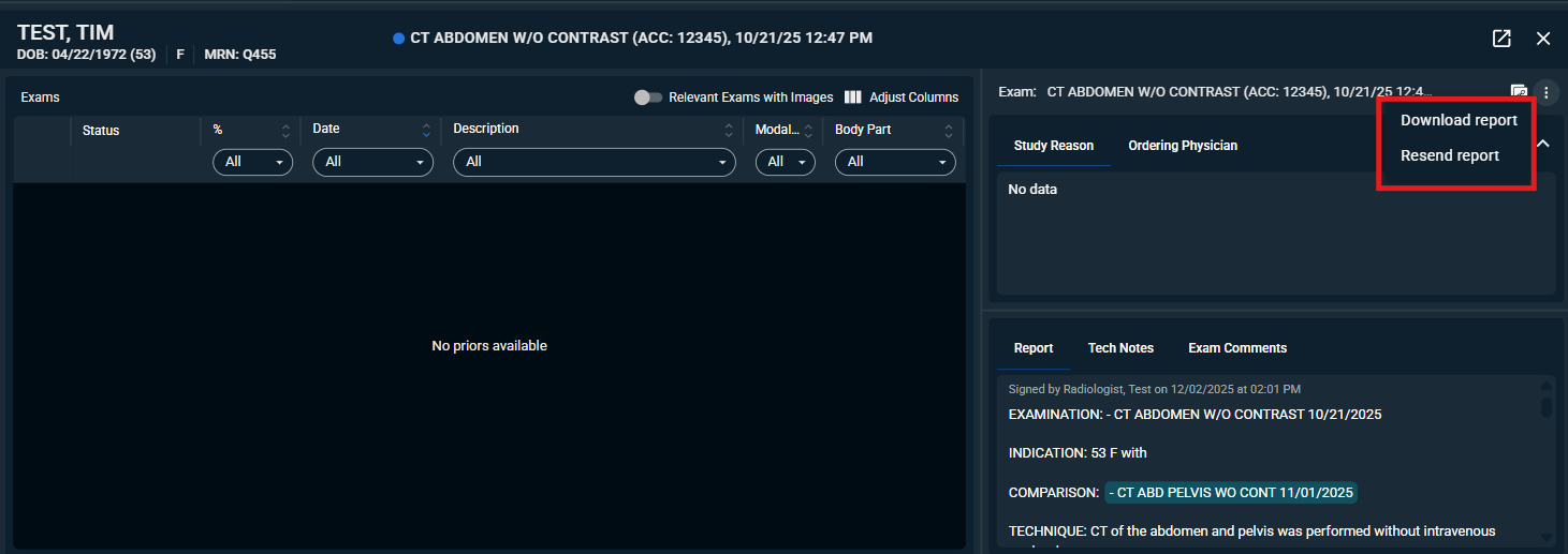 - If the study has not yet been read, the menu will not show the options to download report or resend report.
